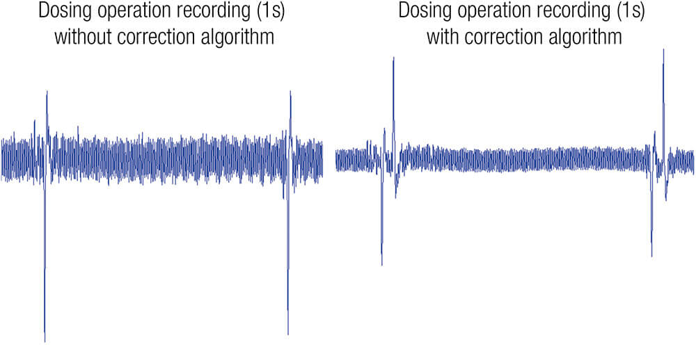 The innovation is based on a series of changes. A lot of data is relevant for a metering process: volume flow, mass flow, material density (depending on temperature and media pressure), current mixing ratio, shot length, dispensing quantity per shot, and various mixing head-dependent times. As before, the volume flow is determined using a gearwheel counter. Each tooth that moves over the sensor sends an electrical pulse. However, up to now this has only been a single-channel process. One sensor detects the rising edge of the electrical pulse. However, two sensors are installed in the gearwheel counter, both of which are now used with the aid of the module. In addition, they each detect the rising and falling edges of the pulses. This results in a 4-channel measurement that captures significantly more and more dynamic data than the classic 1-channel measurement. This eliminates the previous interpolation between the signals – while the “measurement noise” is significantly reduced by a sophisticated algorithm. This means that even the smallest manufacturing or rotation angle errors of the gearwheels can be detected and automatically corrected by the software immediately. To do this, the algorithm uses artificial intelligence to learn to distinguish between measurement noise and actual external influences. Likewise, the software can, for example, detect and compensate for a change due to a manufacturing scatter between two gearwheels – such as when a gearwheel or the gearwheel counter has been replaced.