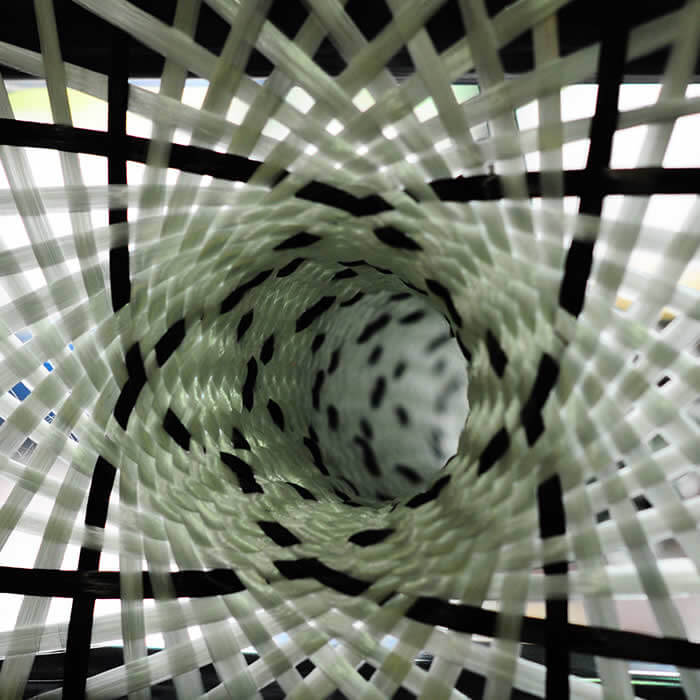 섬유 공급은 슈투트가르트 대학교 비행건설 연구소가 진행하였습니다. 이때 코어는 편조 시스템 로봇의 클램핑 장치에 고정되어 시뮬레이션에서 산출된 편조 경로를 따라 편조 휠을 통해 이동합니다. Project R.A.C.E.에서는 이를 위해 Herzog RF 1/64-100 레이디얼 편조기를 사용하였습니다. 24k의 플라스틱 섬유 로빙으로 구성된 편조 실 64개를 사용하여 텍스타일은 코어 위에 공급됩니다. 여기서 메시를 코어 위에 얼마나 단단히 고정하는지는 보빈의 스프링 강도에 따라 결정됩니다. 스프링 장력이 600g일 때 2축 편조 결과로 최상의 유연성과 강도를 갖춘 결과물을 공급하였습니다.
